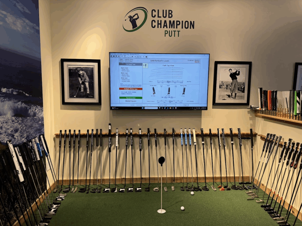 Club Champion Westport features a sleek and enclosed studio space centered around TrackMan launch monitors and SAM PuttLab systems. There are two hitting bays, each outfitted with full projection, data displays, and curated mats. At the front of the store is a putting analysis station with a wide selection of putters and grips.