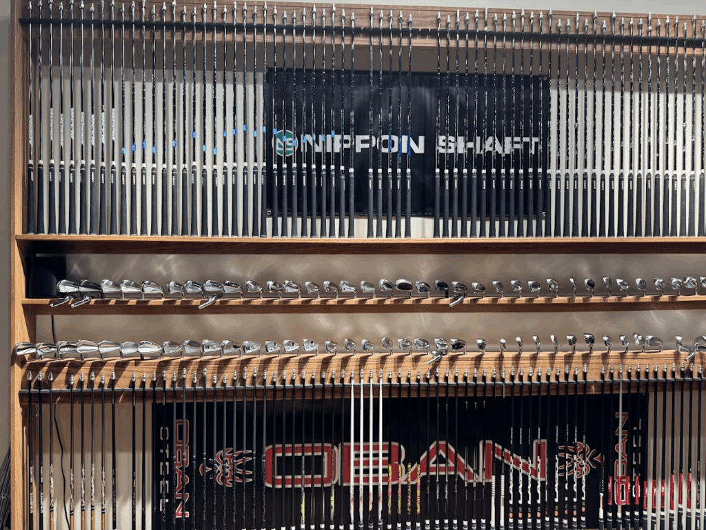 The build-out is top-tier: walls lined with rows of driver and iron heads, shelves of shafts by Nippon, Fujikura, Mitsubishi, Oban, True Temper, KBS, Project X, Graphite Design, and others, plus premium iron heads from brands like Miura, PXG, Titleist, Ping, Callaway, TaylorMade, Srixon, and Cobra. For putters, options include Scotty Cameron, Bettinardi, Odyssey, and Evnroll.