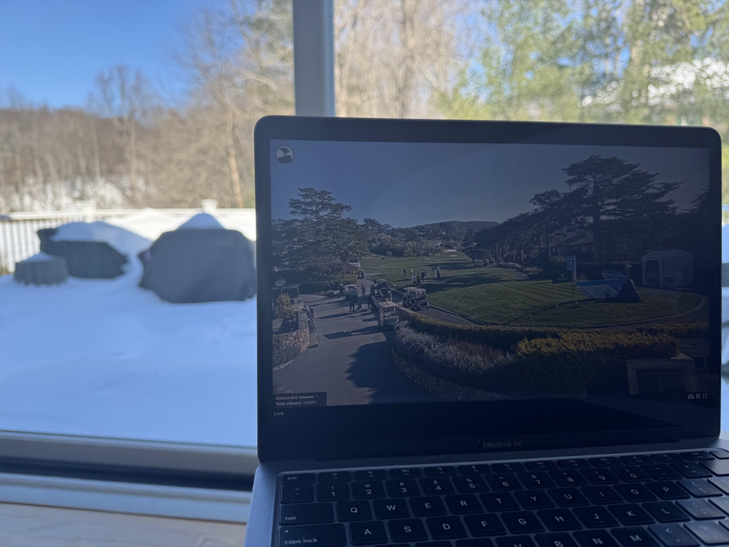 It’s been unusually cold in Connecticut this winter—snow banks lining every street, ice on the driveway, and every golf course in the state locked up tight until at least March. I’ve been grinding rounds at XGolf and GSPro, playing Pebble Beach virtually more times than I can count, but there’s something about staring at a simulator screen that makes you want the real thing even more. Then a coworker mentions that there’s a webcam on the first tee of Pebble Beach and suddenly I’m looking at flights, checking tee times, and convincing myself that now is the time. I want to shank a ball off the tee myself, not watch others do it!