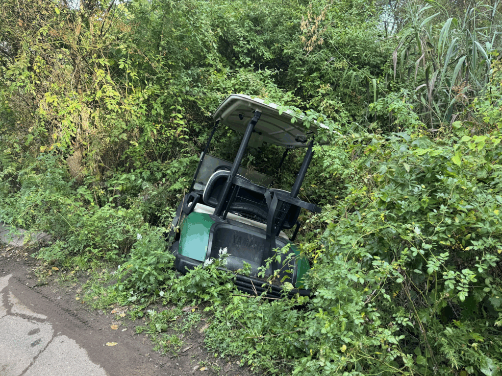 That golf cart stuck in the rough is wild